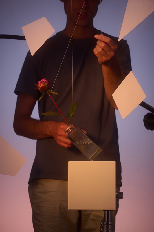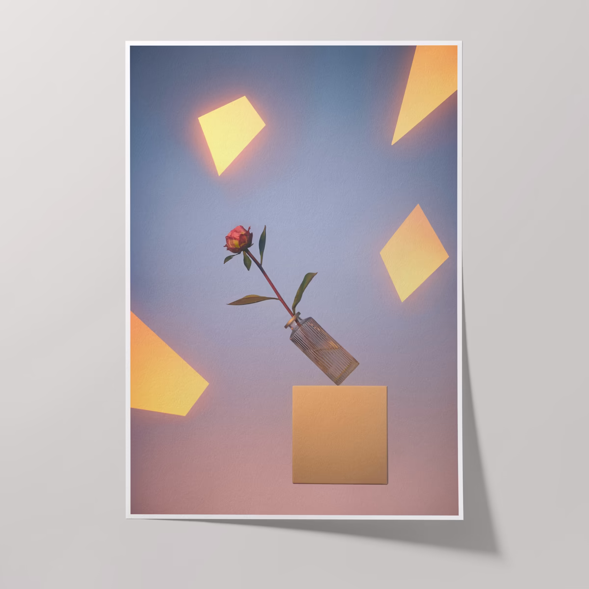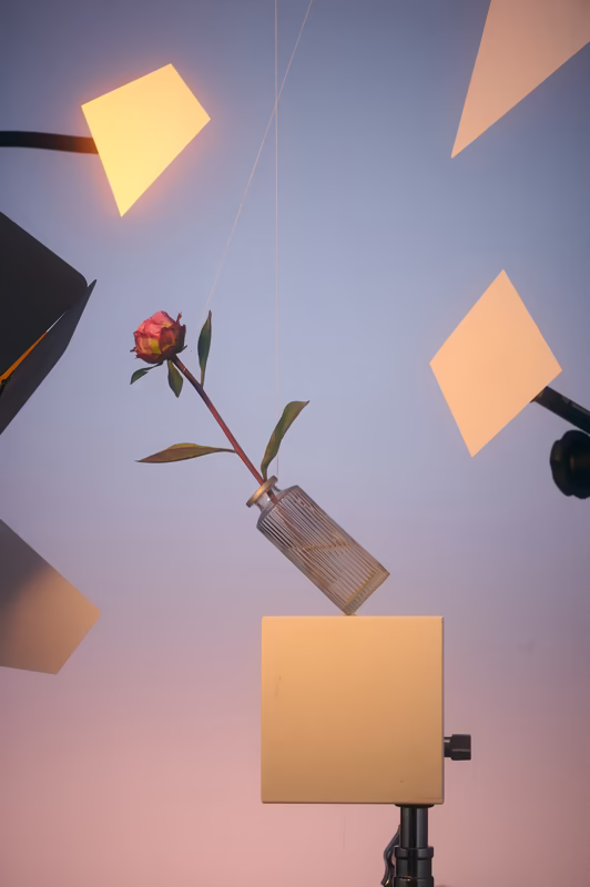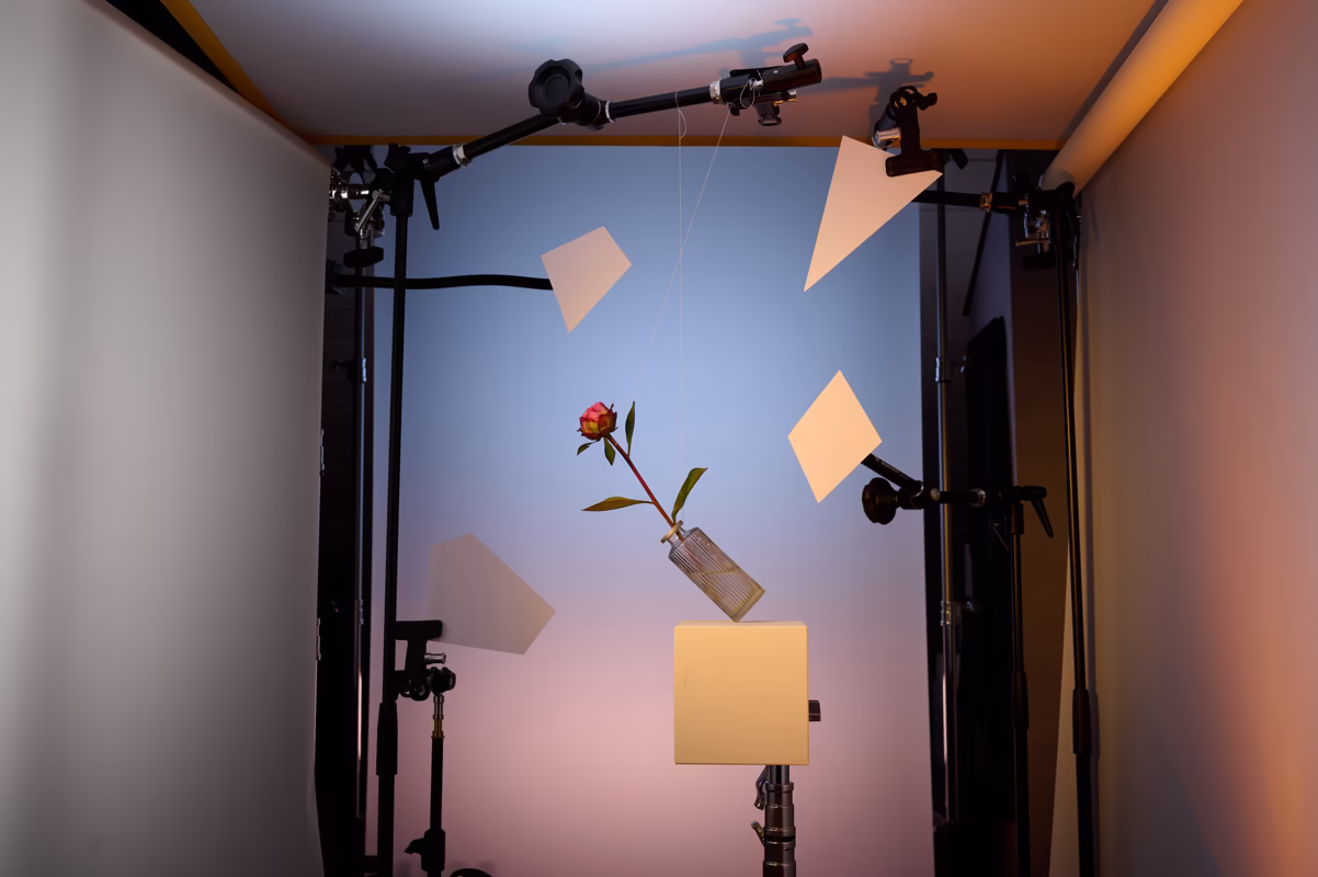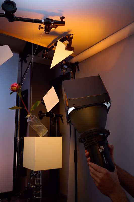 In this particular case, to oppose the plasticity of the flower, the vase and the cube, we used small pieces of paper, lit in such a way that the light produces a smooth yet strong gradient, resulting in an interesting glow. All three-dimensional objects in the scene are being shown from the side, just like the papers, which further emphasizes the play between the volume.
