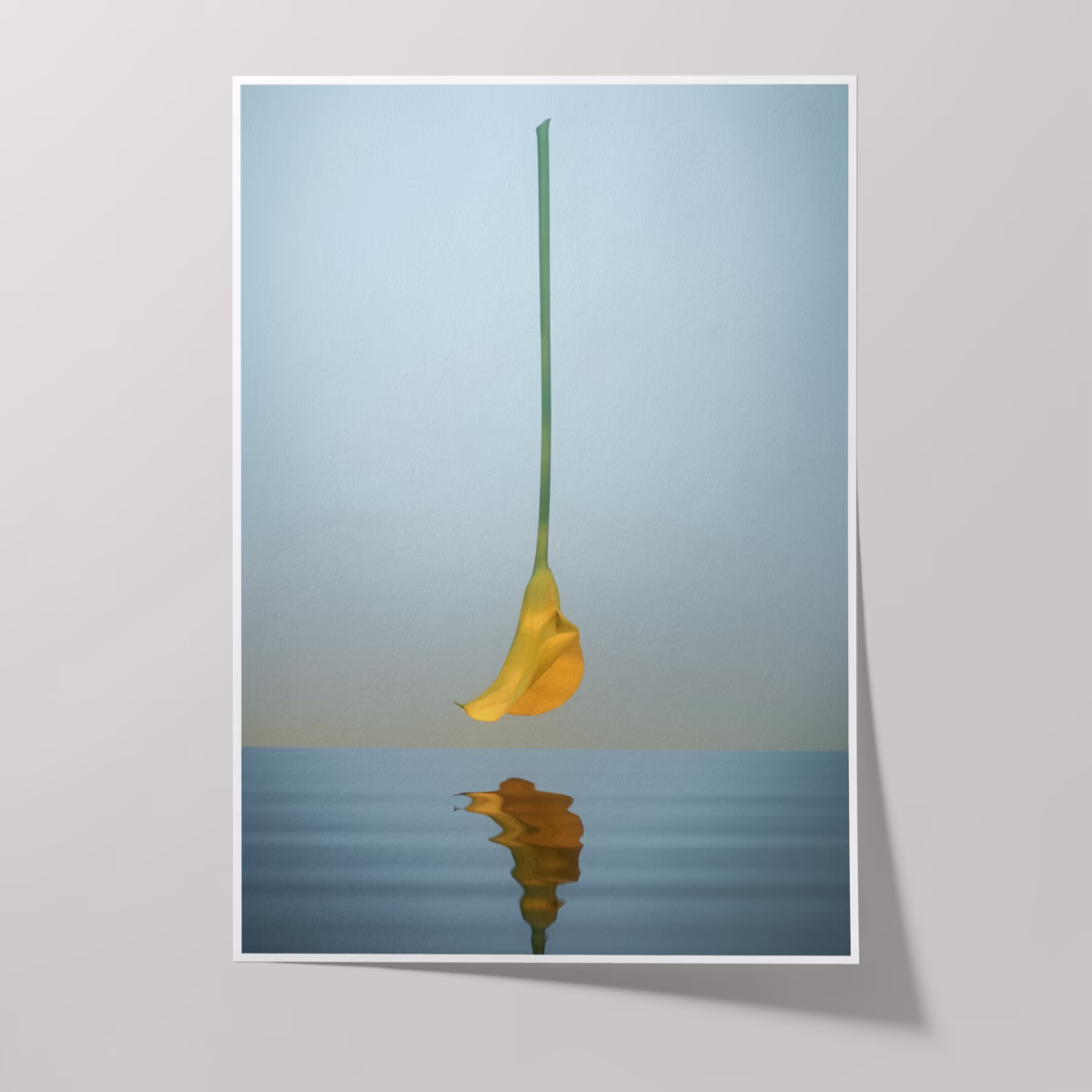 A delicate yellow flower hovers over calm water whose surface is gently rippled by subtle waves. Soft rays of light reflect from the water back to the flower, casting gentle light on the delicate bud.