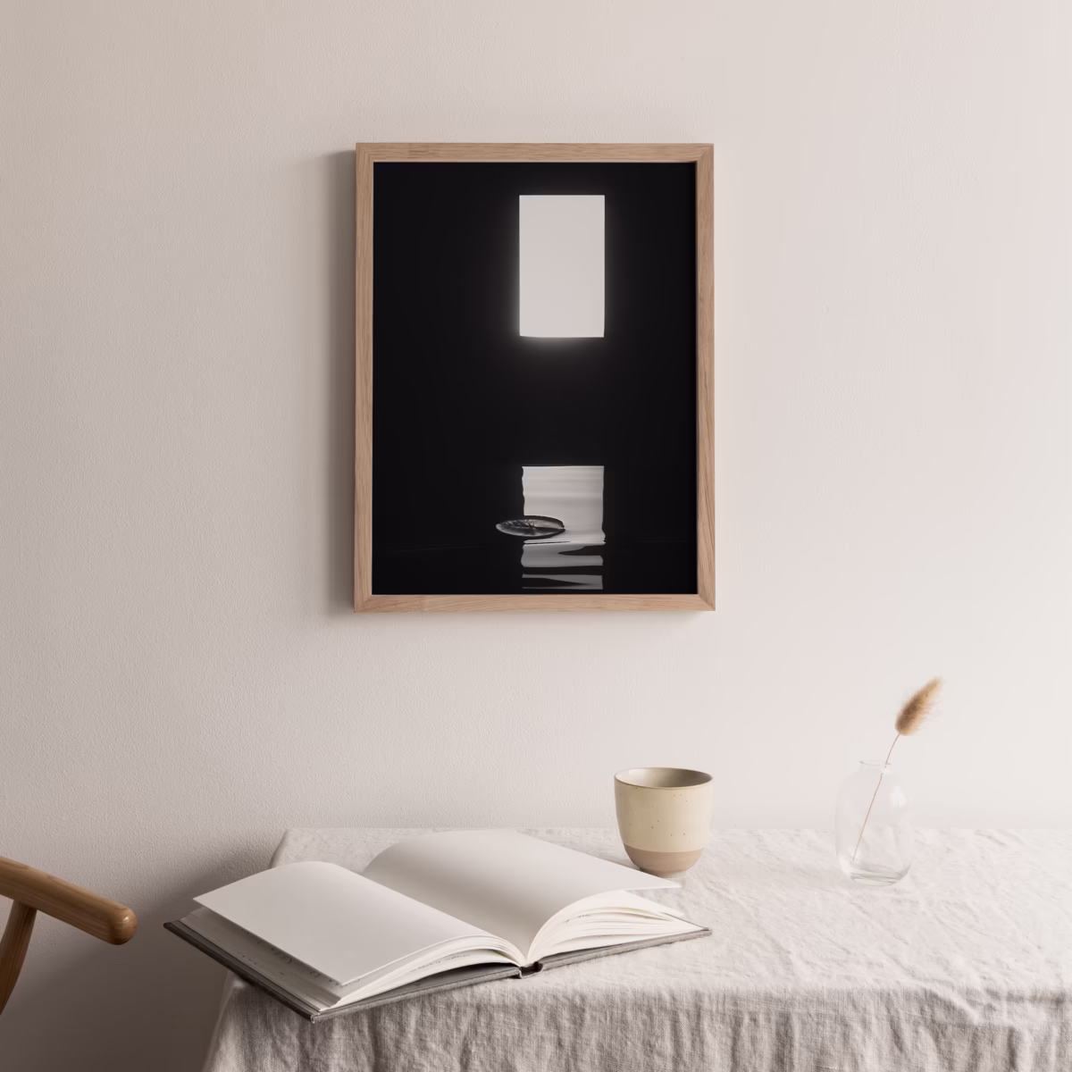 This work builds a triptych together with two other works: “Water Lily” and “Abstract I” — a series discovering the play of light and shadow in the reflection of water. In this pretty minimalistic work, a leaf of a water lily swings on the waves, lit by the only available light source:…