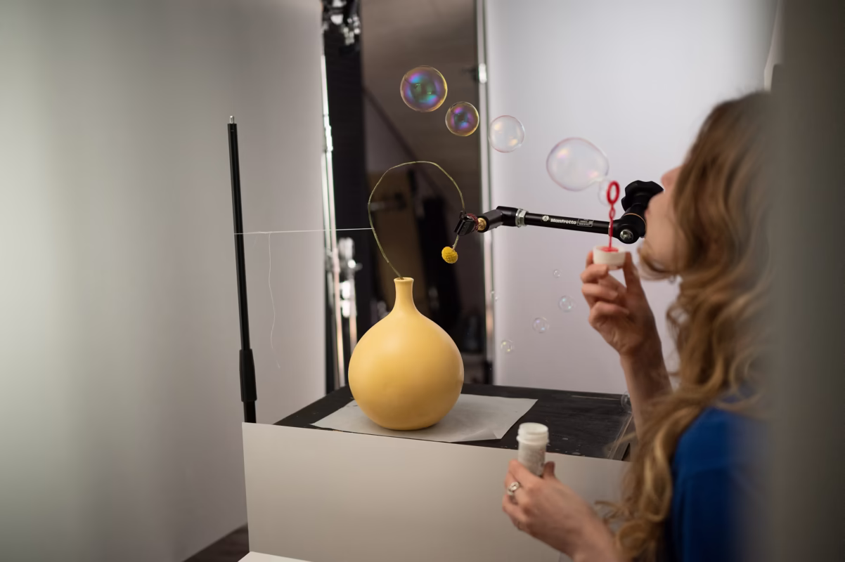 We wanted to create something that would remind of a classic still-life painting, though with a bit of a modern touch. Here we have all the common components: a vase standing on the table, flowers... and some soap bubbles.
