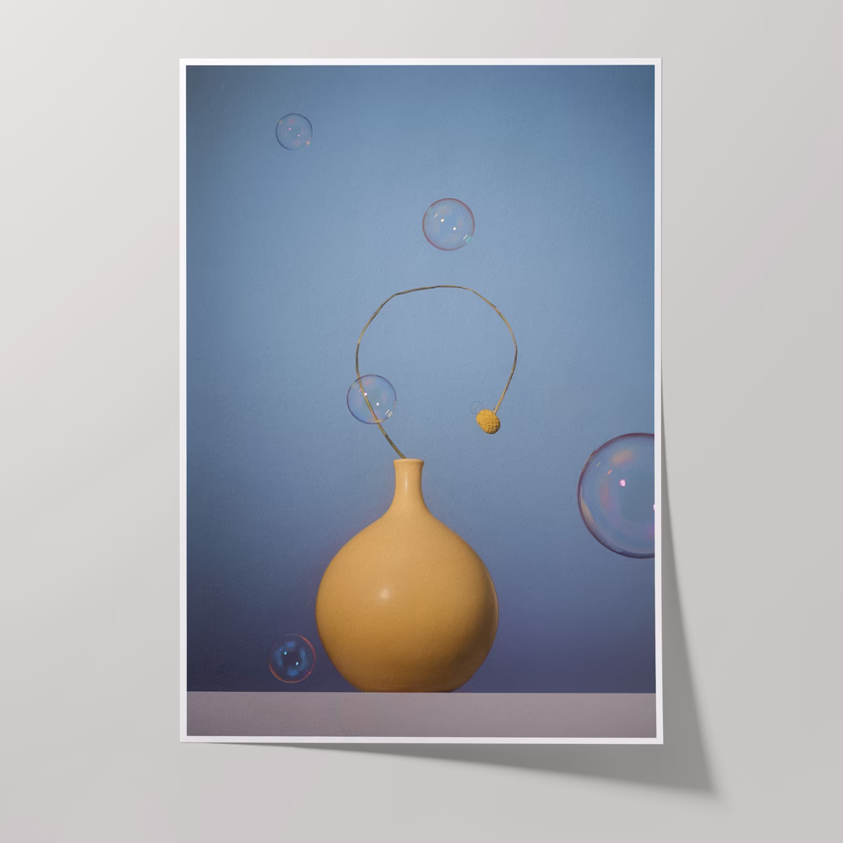 While sharing similarities with classic still-life paintings, “Yellow Vase” introduces an abstract touch through its unusual composition, incorporating oval forms and ethereal soap bubbles.